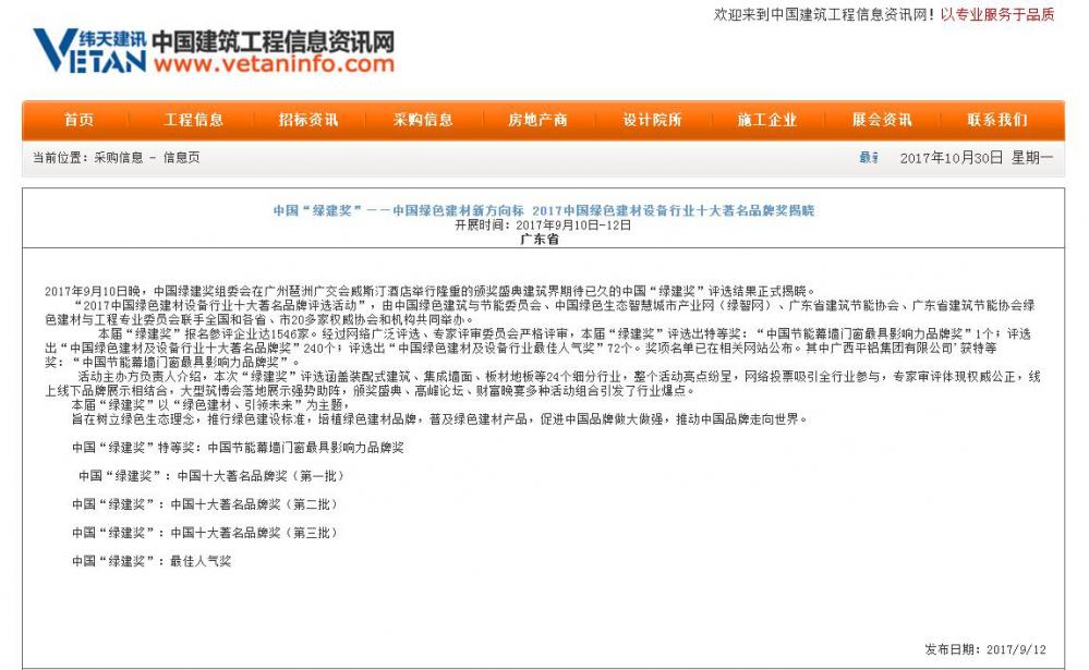 中國門窗幕墻資訊網(wǎng)發(fā)布有關(guān)2017中國綠色建材設(shè)備行業(yè)十大著名品牌獎的報道 (2017-10-30)